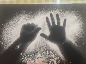 课堂上,孩子们围坐桌前,将小手摆出飞鸟、拳头、花朵等造型,老师轻撒面粉,当小手移开的瞬间,黑卡纸上便浮现出一个个灵动的手影轮廓。紧接着,孩子们用面粉在影子上添画,有的为影子加上圆眼睛和小嘴巴,让它变成微笑的小人;有的画出犄角与尾巴,将影子变成威风的小怪兽。